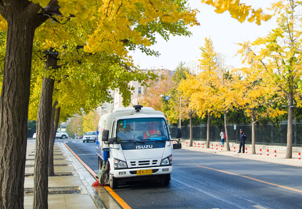機洗(洗掃車洗掃吸一體)→機保(保潔車巡回保潔)→人沖(手持槍沖洗人行道)→人工(人工清掃保潔) -